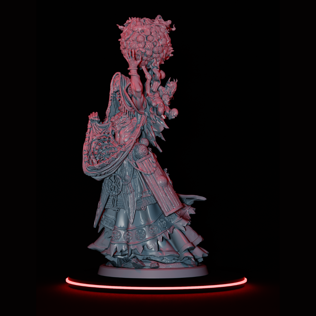 Le Présage Hurleur parle d’une voix rauque, un chœur de voix dérobées résonnant depuis les nombreuses peaux étirées qui recouvrent son être.