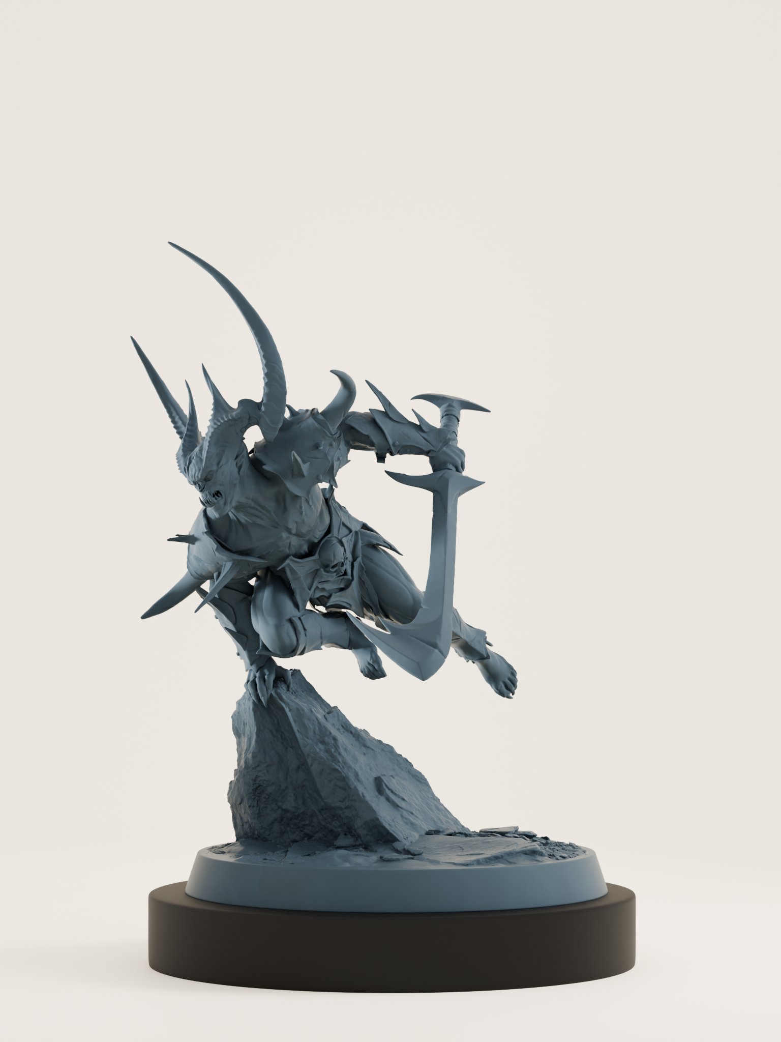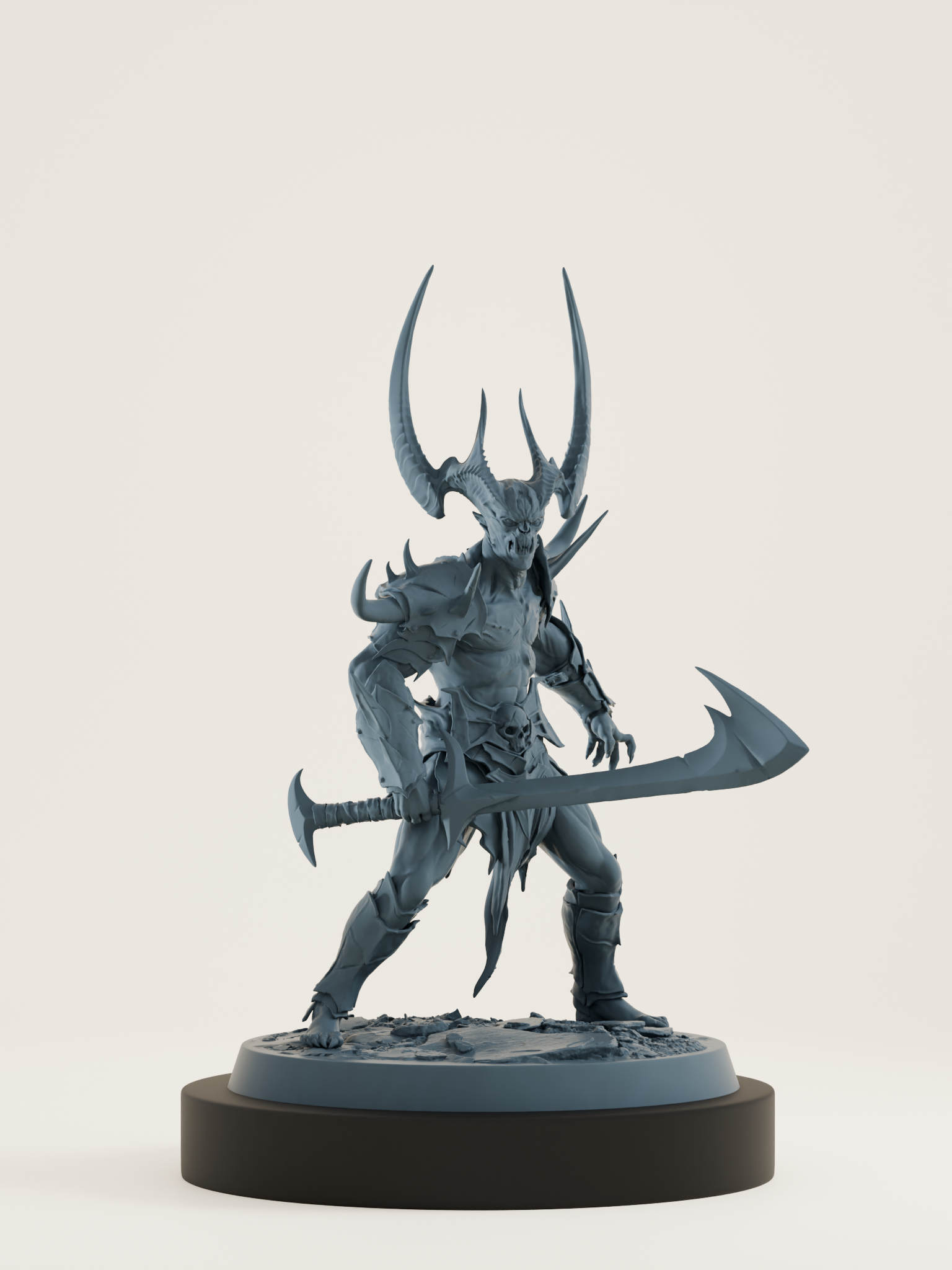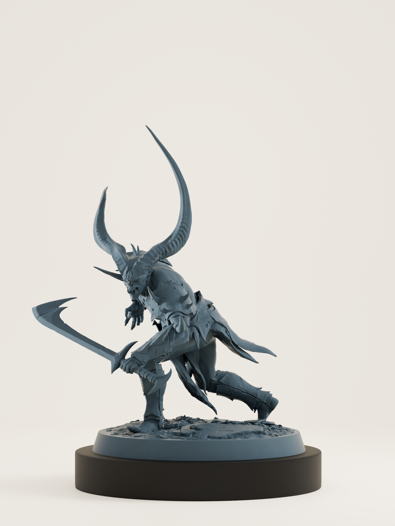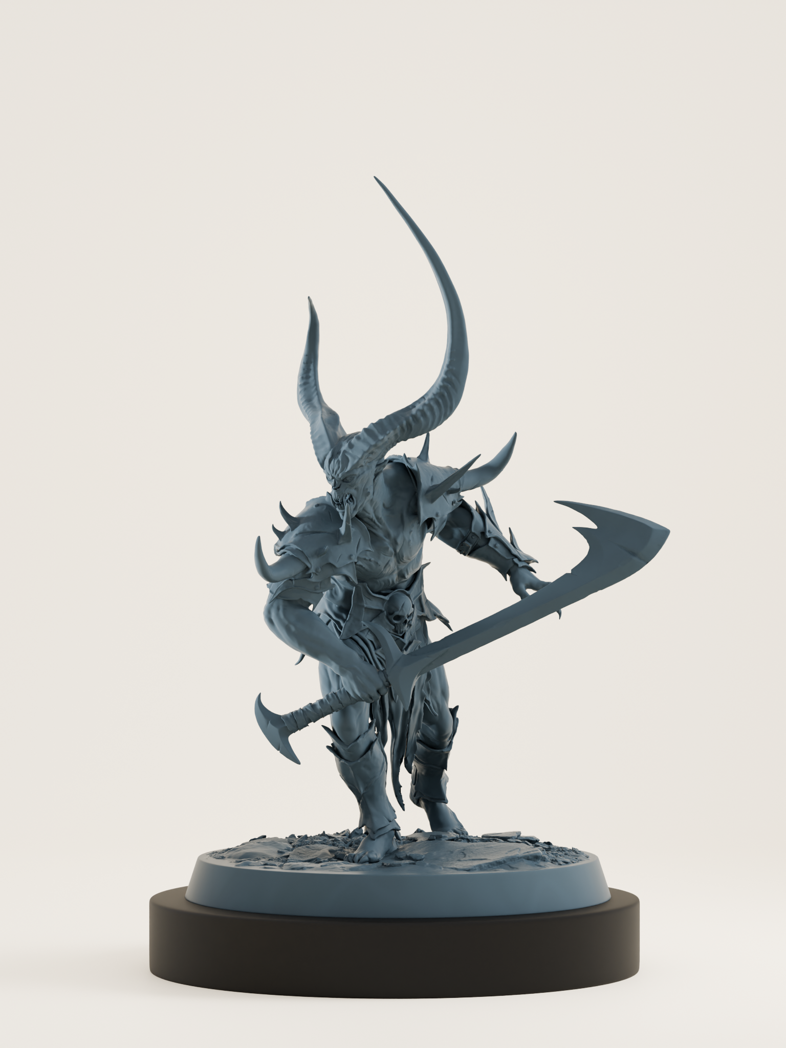 Ces créatures font partie de la Légion des Damnés, une armée démoniaque autrefois scellée dans les Enfers de Fer. Libérés par la chute d’un pacte ancien, ils avancent en rangs serrés, menés par une volonté commune : répandre la ruine dans les Royaumes du Haut. Chaque guerrier porte une armure fusionnée à sa chair et des cornes forgées dans la douleur de son asservissement.