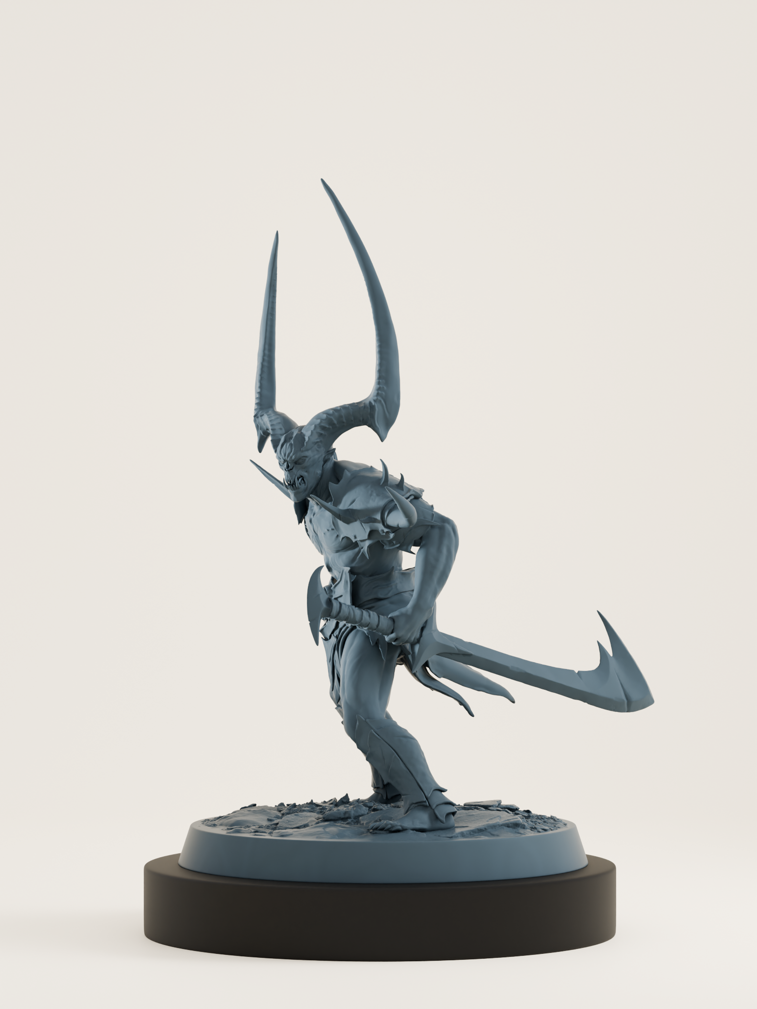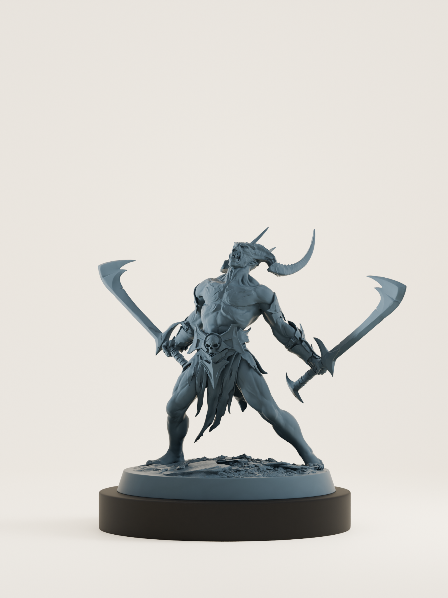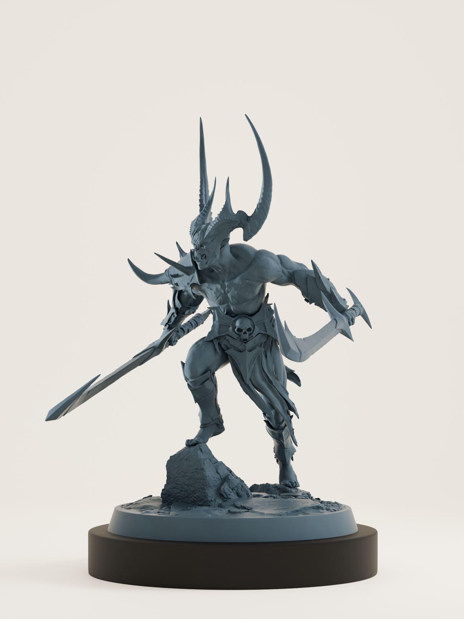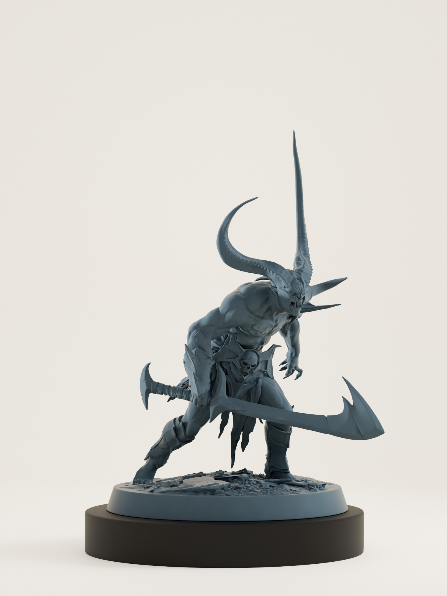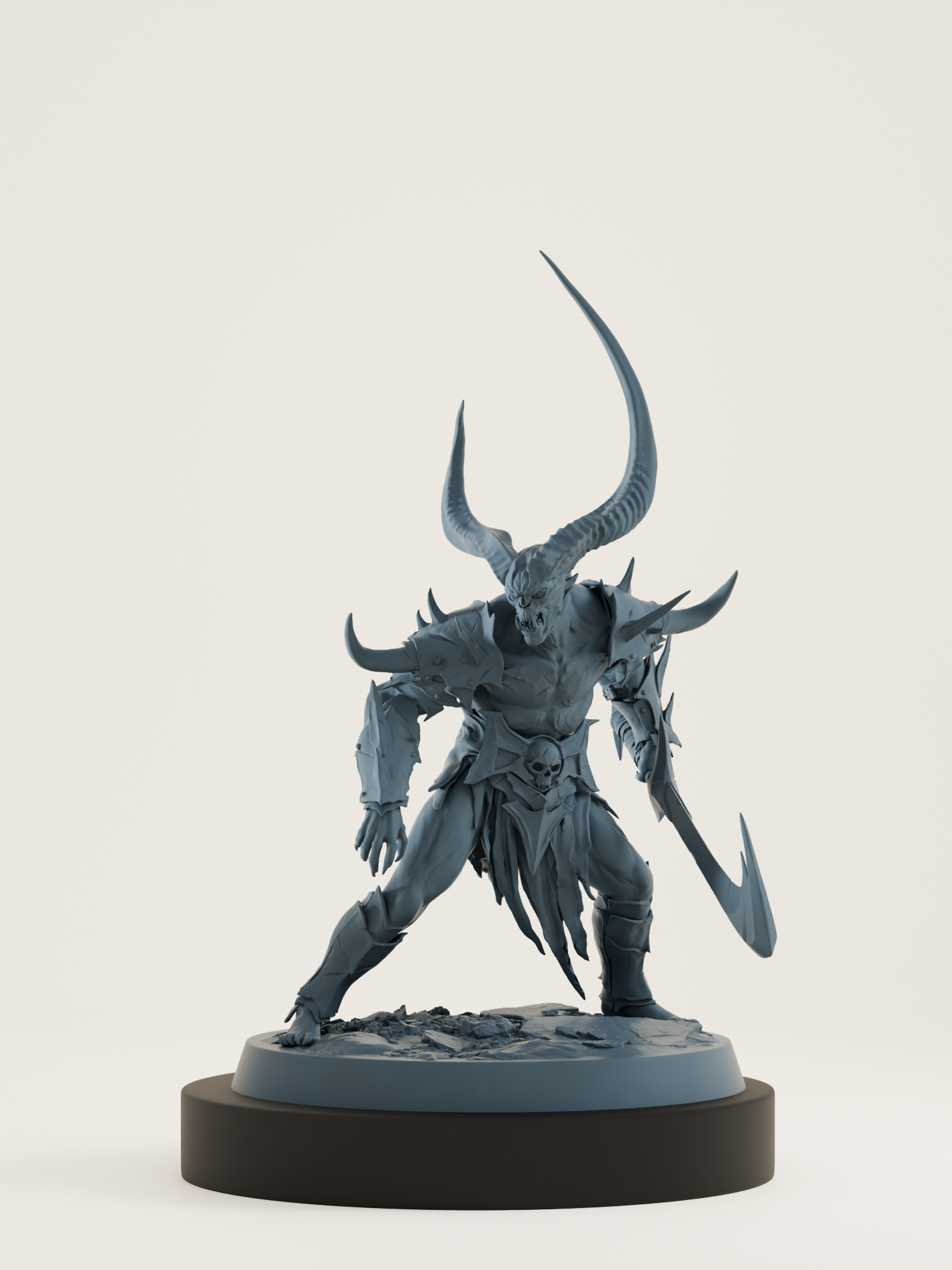 Ces créatures font partie de la Légion des Damnés, une armée démoniaque autrefois scellée dans les Enfers de Fer. Libérés par la chute d’un pacte ancien, ils avancent en rangs serrés, menés par une volonté commune : répandre la ruine dans les Royaumes du Haut. Chaque guerrier porte une armure fusionnée à sa chair et des cornes forgées dans la douleur de son asservissement.