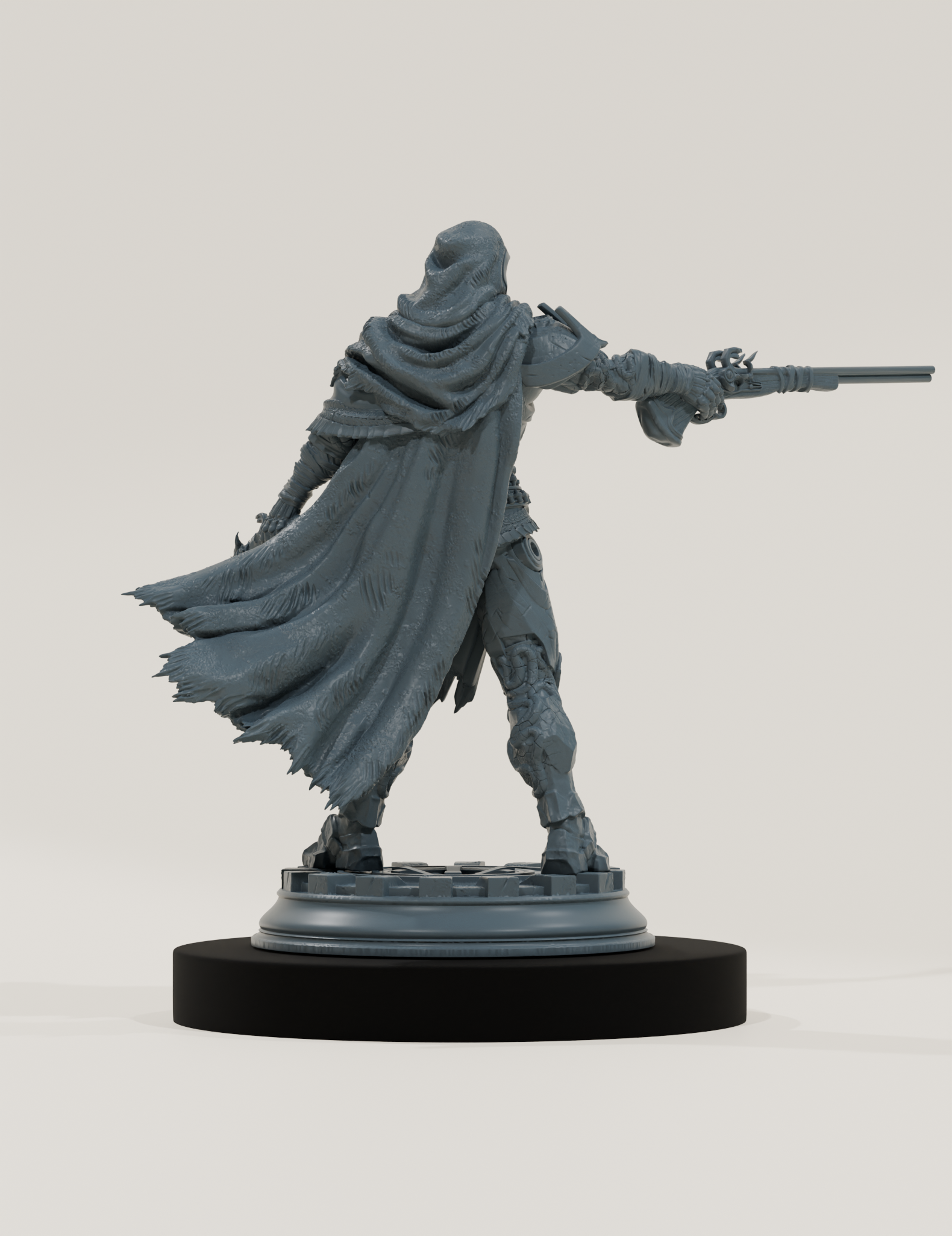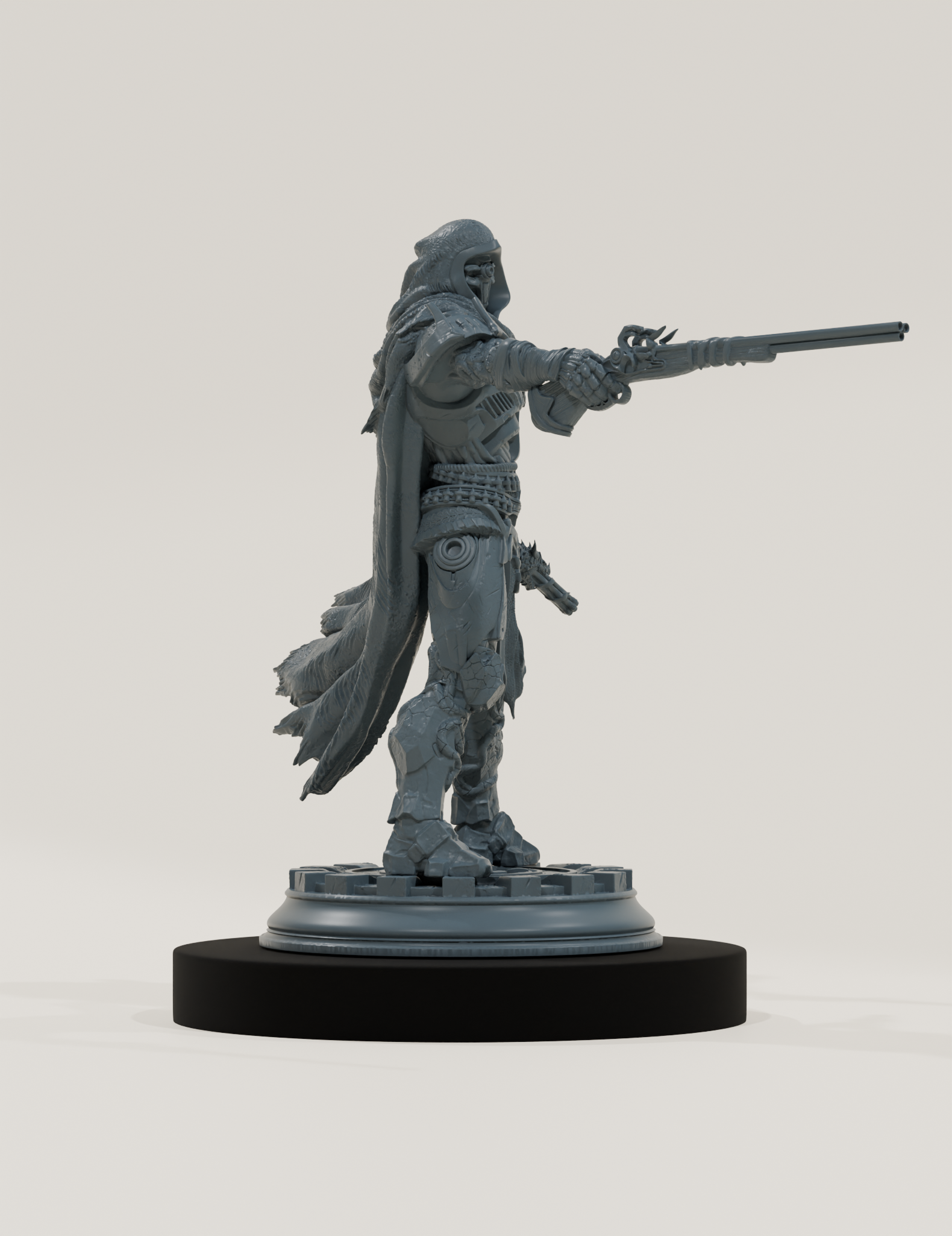 Le mélange de textures entre la cape en tissu usé, le chapeau de cow-boy et les parties robotiques offre un défi très intéressant pour les peintres de miniatures. C'est une pièce de caractère, idéale pour jouer un chasseur de primes taciturne ou un justicier errant.