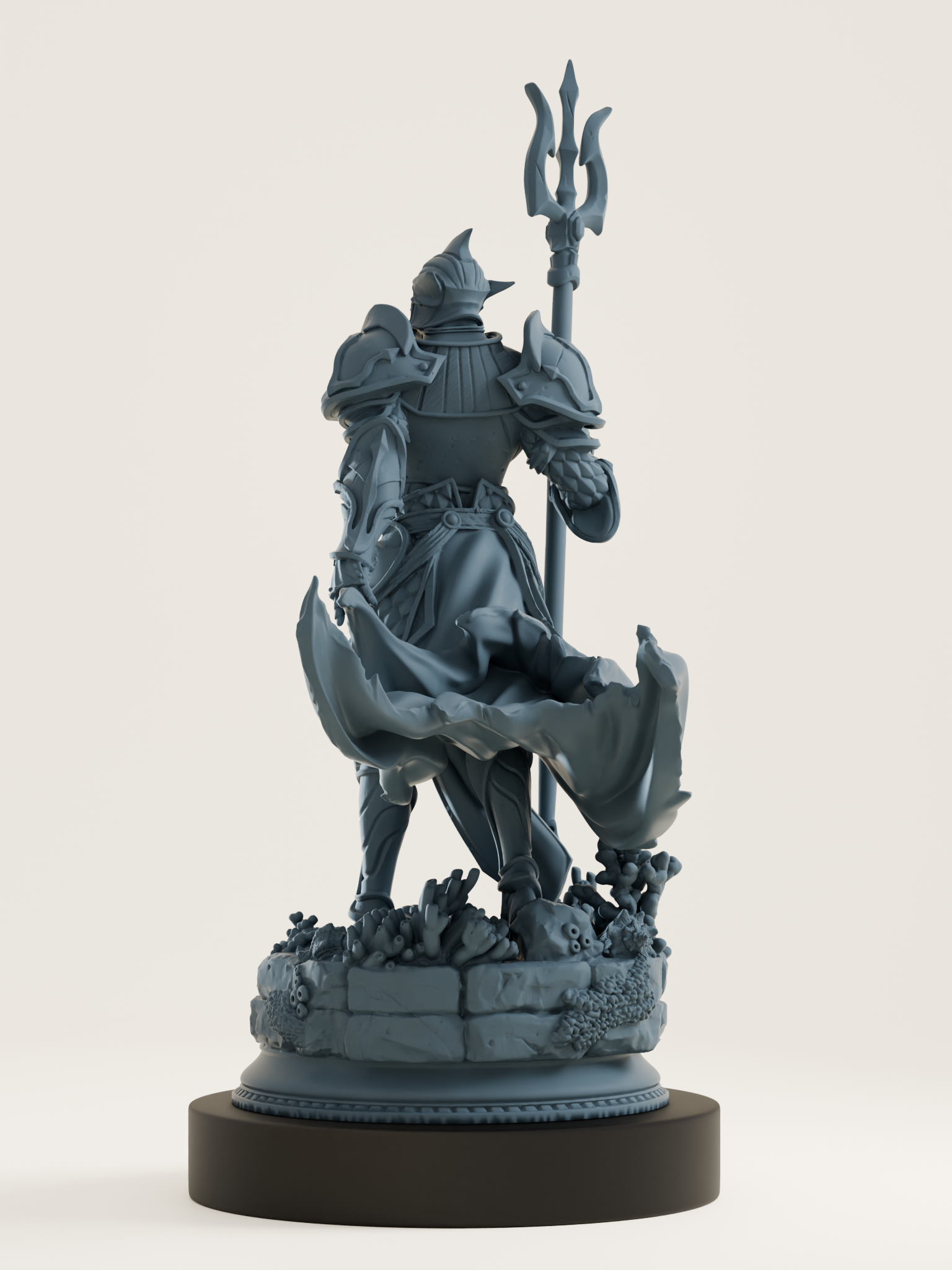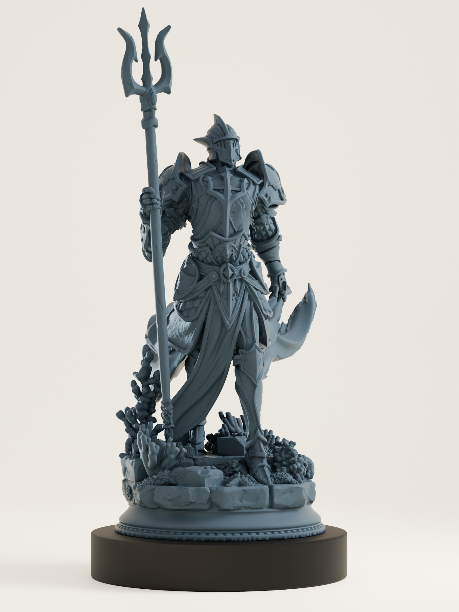 Son trident fend les flots comme le jugement des marées. Drapé dans les bénédictions de la mer, il se dresse tel un phare contre les ténèbres.