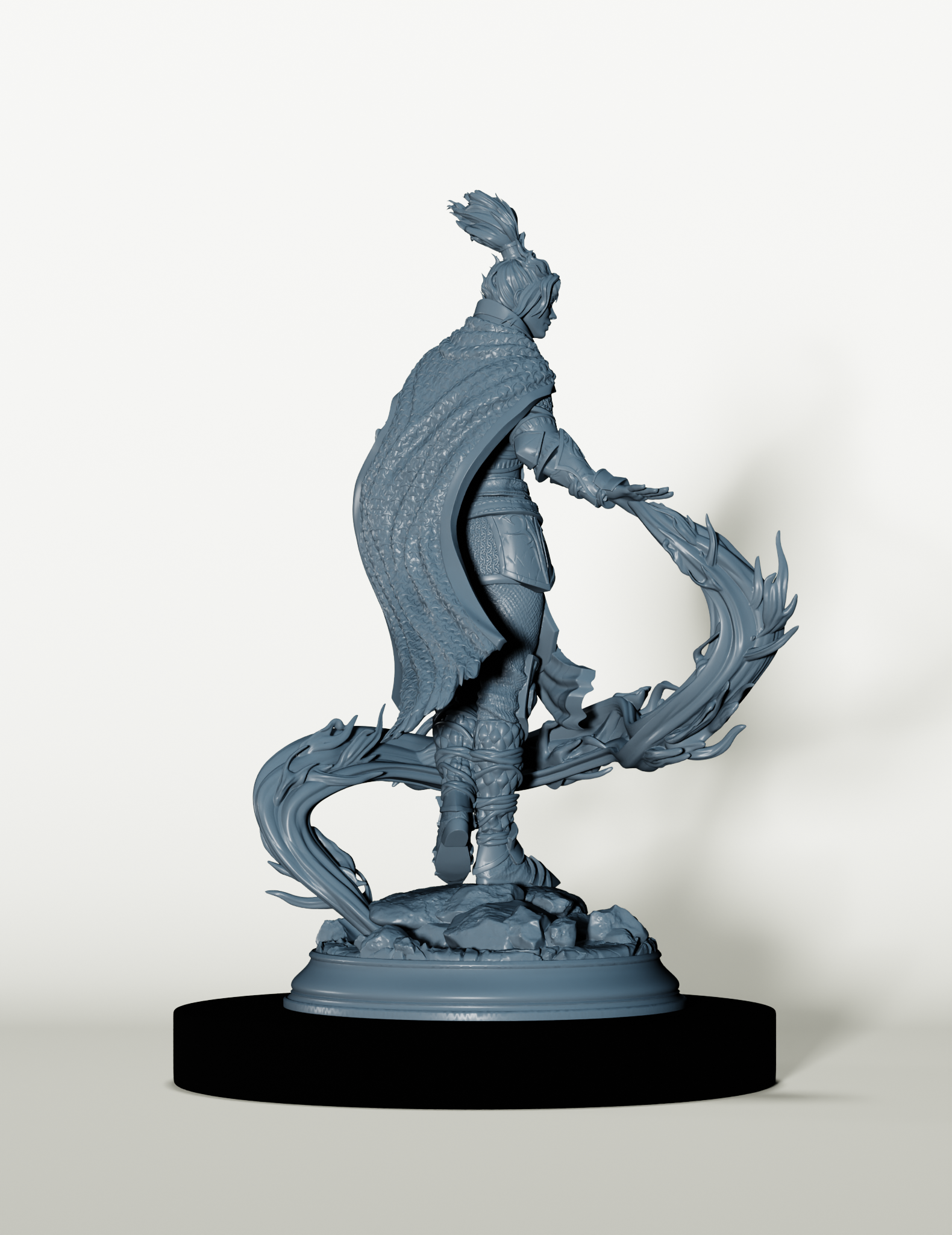 Spécialiste de l'évocation et de la mobilité, elle maîtrise des sorts dévastateurs comme Mains Brûlantes ou Rayon Ardent, tout en étant capable de se repositionner instantanément grâce au sort Pas Brumeux. Elle dispose également de défenses réactives puissantes telles que le sort Bouclier pour dévier les attaques physiques imminentes. La sculpture met en valeur les détails de ses tenues de voyage et l'aura d'énergie magique qui l'entoure, offrant un support magnifique pour les peintres souhaitant expérimenter des effets de lumière magique et de flammes.