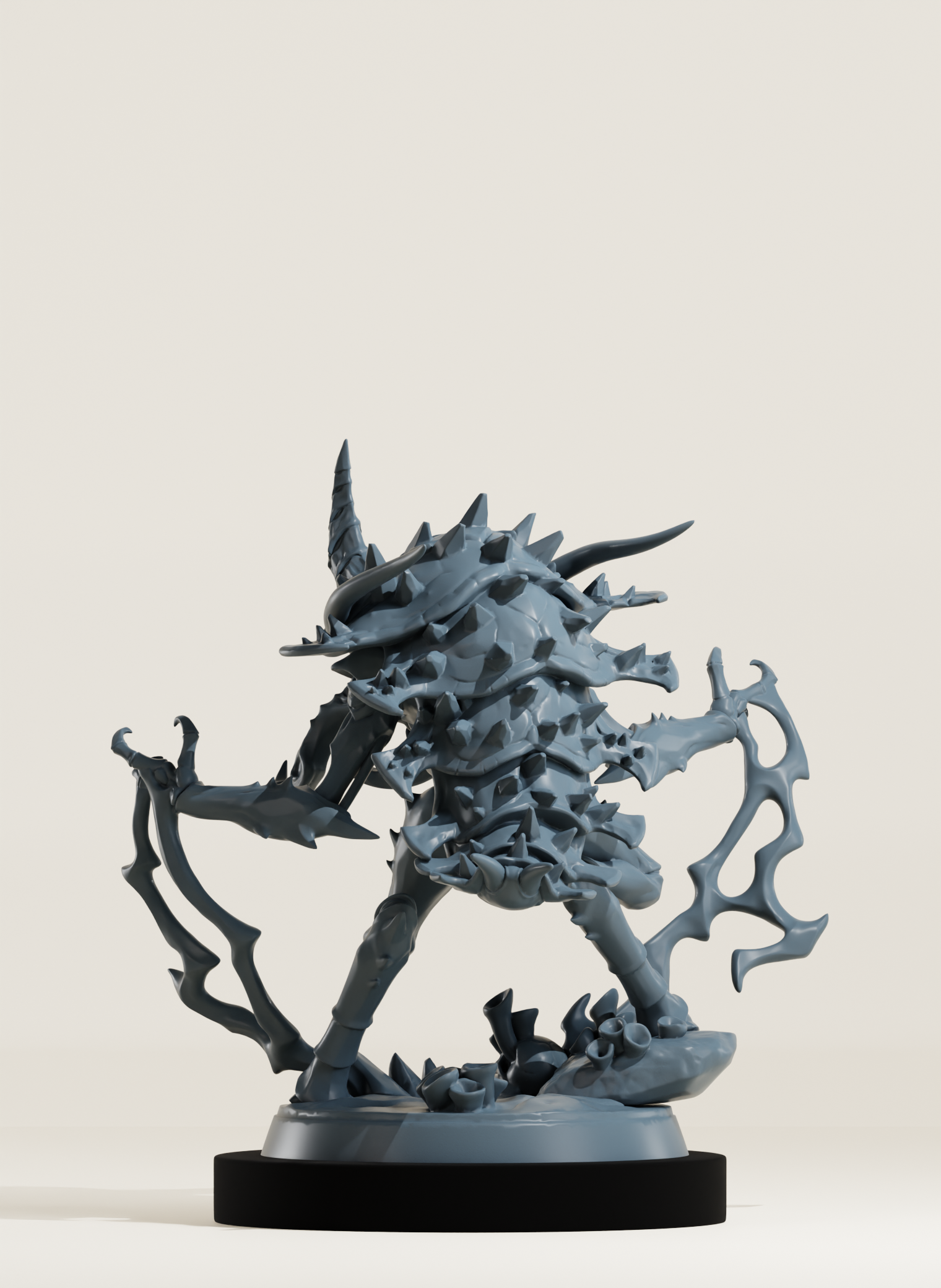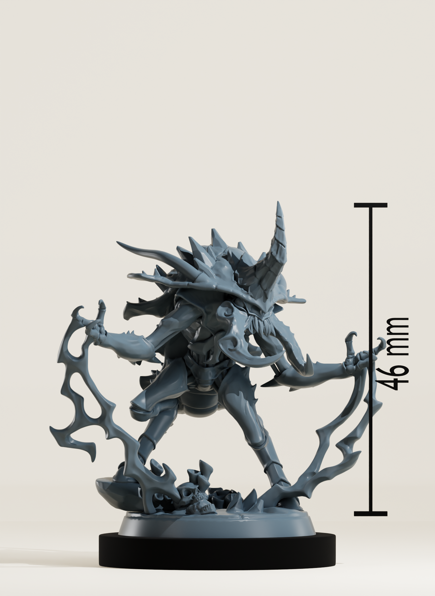Skarnith est l’un des champions de la ruche Zeek, une race ancienne d’insectoïdes intelligents qui communiquent par ondes mentales et manipulent la matière vivante à l’état brut. Sur le champ de bataille, il ne parle pas : il domine l’esprit de ses ennemis, fait léviter ses armes et réécrit la réalité autour de lui avec une précision glaçante. Sa base décorée de crânes suggère un passé chargé de conquêtes, et sa carapace ornée de cornes évoque un hiérarque impitoyable.