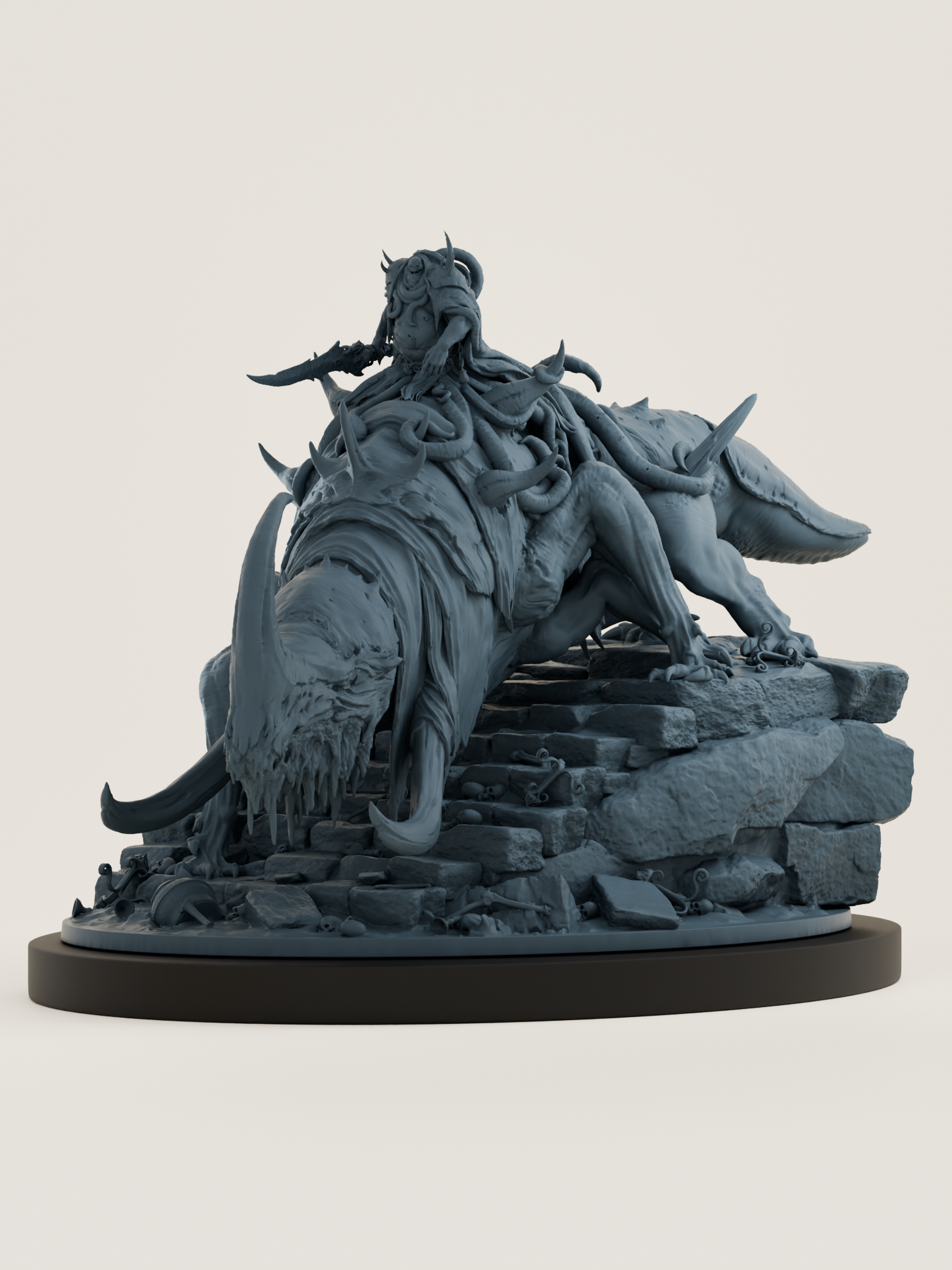Issu des entrailles putrides du Mawcoil, ce titan rampant fut invoqué par une secte d’alchimistes désespérés, prêts à tout pour survivre à la peste. Fusion de bêtes disparues, de chair corrompue et de magie noire, il s’élève au sommet des ruines, portant sur son dos un sinistre cavalier vêtu de loques. Là où il passe, les pierres moisissent, les rivières bouillonnent, et les vivants fuient ou pourrissent sur place.