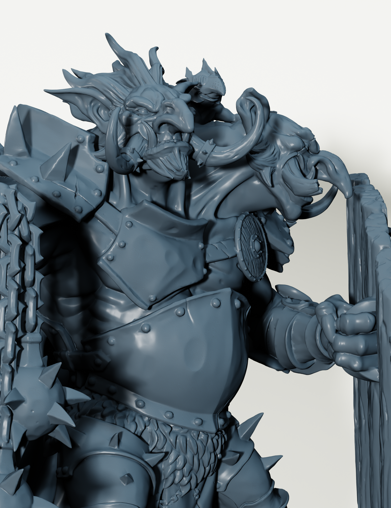 Ce chef de guerre troll, harnaché d’une armure cloutée, dirige ses raids d’une poigne de fer, écrasant ses ennemis sous sa masse cruelle.