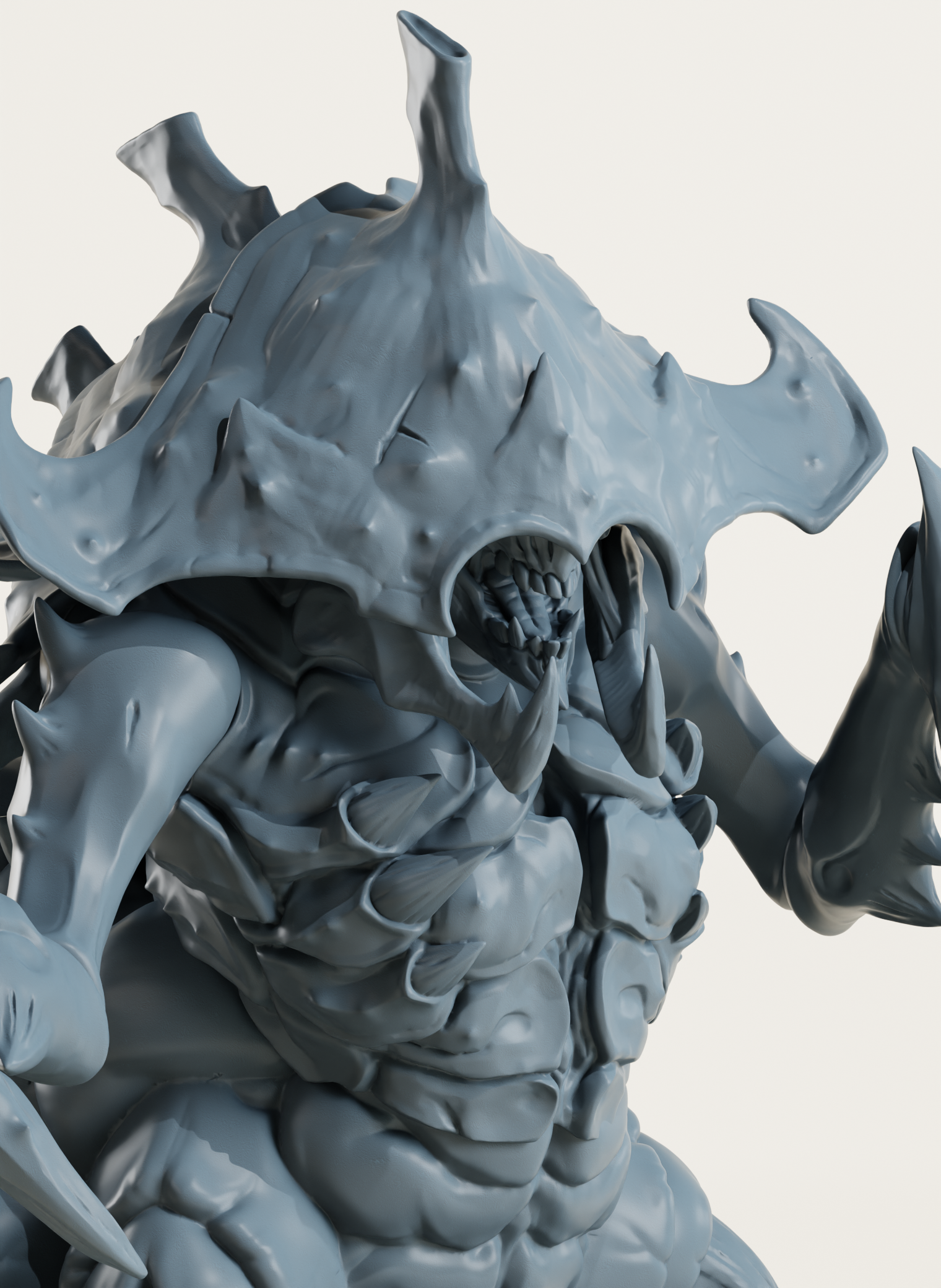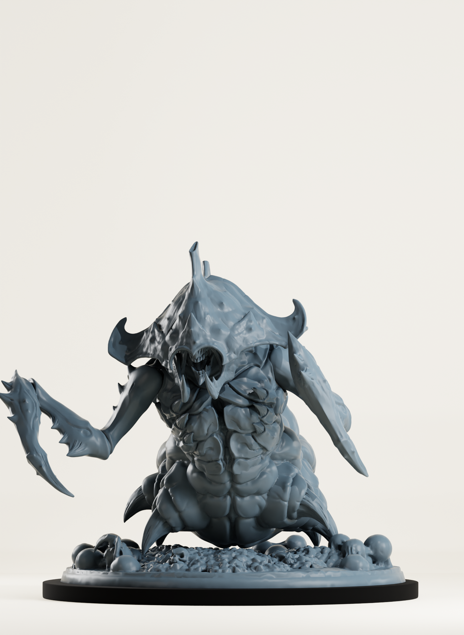 Parfaite pour représenter un boss final, une entité alien, une mère pondeuse ou une créature d’une autre dimension. Sa sculpture est extrêmement détaillée, avec une pose menaçante, une bouche garnie de mandibules, une armure naturelle massive et des membres en lames segmentées.